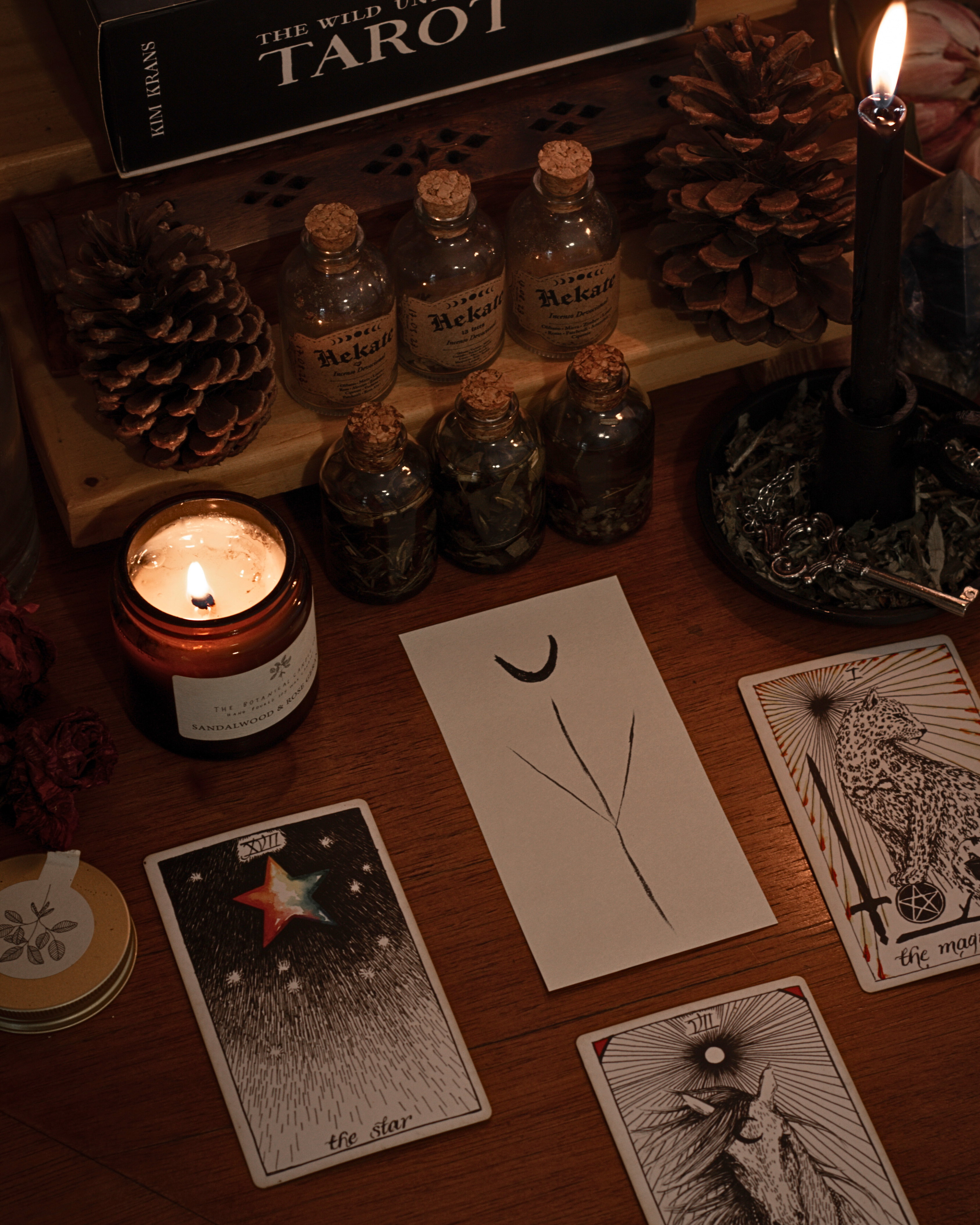 Nesse jogo você escolhe um assunto da sua vida e várias perguntas são feitas para o tarot para entender em qual lugar do seu caminho você está nessa questão. É um jogo com cartas que saem em posições fixas, formando o desenho da tiragem criada por mim e consagrada à Hekate. Cada posição irá te responder as seguintes perguntas e outras:
